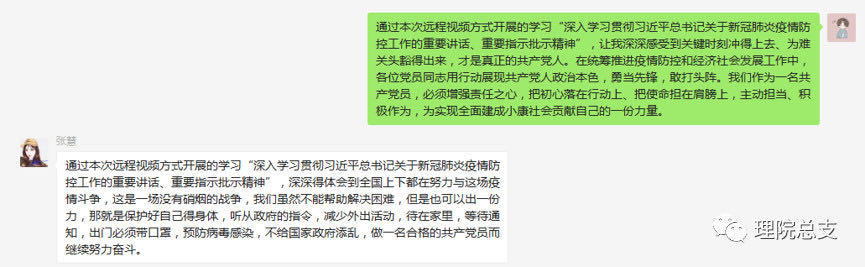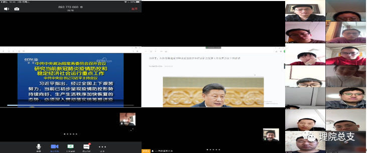 会议第一项,党支部书记包文明老师首先组织全体党员同志观看了《习近平主持中共中央政治局常务委员会会议并发表重要讲话》这段视频资料,结合他自身的认识,对“习近平总书记关于新冠肺炎疫情防控工作的重要讲话、重要指示批示精神”进行了一个关于他自身的理解和感悟。会议第二项,每位党员发表一下关于《习近平主持中共中央政治局常务委员会会议并发表重要讲话》这段视频资料的学习感想,并结合自己在疫情期间的学习、生活、工作等方面的实际情况谈一下自己的心得体会。