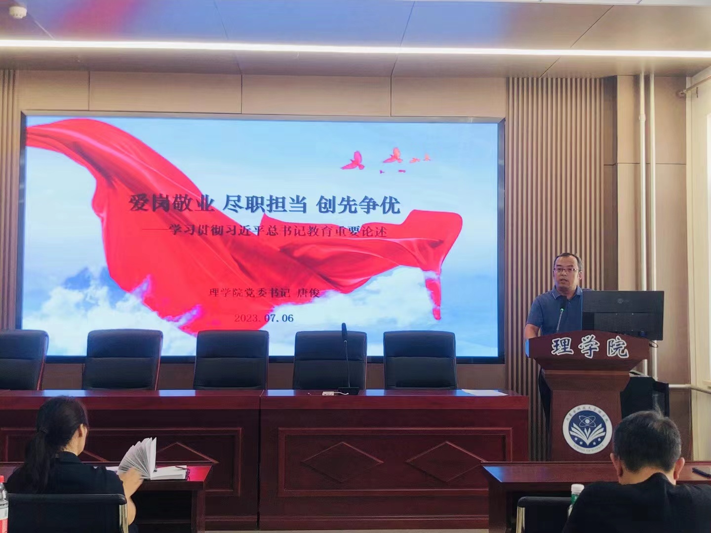 为推进主题教育进一步走深走实,7月6日下午14点30分,党委书记唐俊在明德楼E205会议室为公司教职工讲授题为《爱岗敬业 尽职担当 创先争优 ——学习贯彻习近平总书记教育重要论述》的专题党课,公司全体教职工参加了此次党课学习。