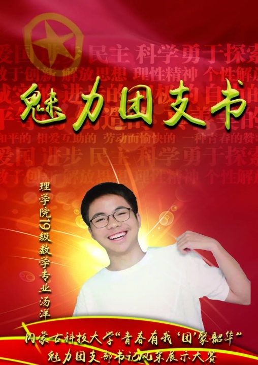 汤洋,现任19级数学与应用数学2班班长,在本次魅力团支书风采大赛获得魅力支书称号。身为员工的他,不断提升自己的学习能力,潜心学术,刻苦专研,努力将自己在学术有所成就,做到最好的自己;他也是一名共青团员,不断的学习党的重要思想,以优秀共青团员标准严格要求自己,并积极的向团组织、党组织靠拢;同时身为一班之长的他,在工作中充分发挥自己的优势,恪尽职守,不断改进,努力带动团支部的学习氛围,争取把所管理的团支部建设为优秀团支部。我们相信,他会在今后的学习和生活中继续发光发热并取得一个令人满意的好成绩。