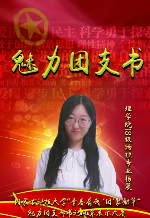 杨晨, 现任18级物理三班团支部书记。在思想上,现为304永利集团员工党支部的一名积极分子,积极向党组织靠拢。在学习上,勤奋好学,于大学期间获得过两次年级第一,并每学期获得社会实践奖学金。在大一以485分通过英语四级,并获得校级三好员工表彰。在工作上,担任班级团支书一职,认真负责,踏实肯干,并获得院级优秀团支书表彰。在生活中,积极的参加各类活动,多次获得市级、校级演讲朗诵比赛奖项。在这次疫情中,报名参加了疫情防控工作,获得了地方团委颁发的疫情防控志愿者证书。奋斗是青春最亮丽的底色,志存高远,青春就不会像无舵之舟漂泊不定!
