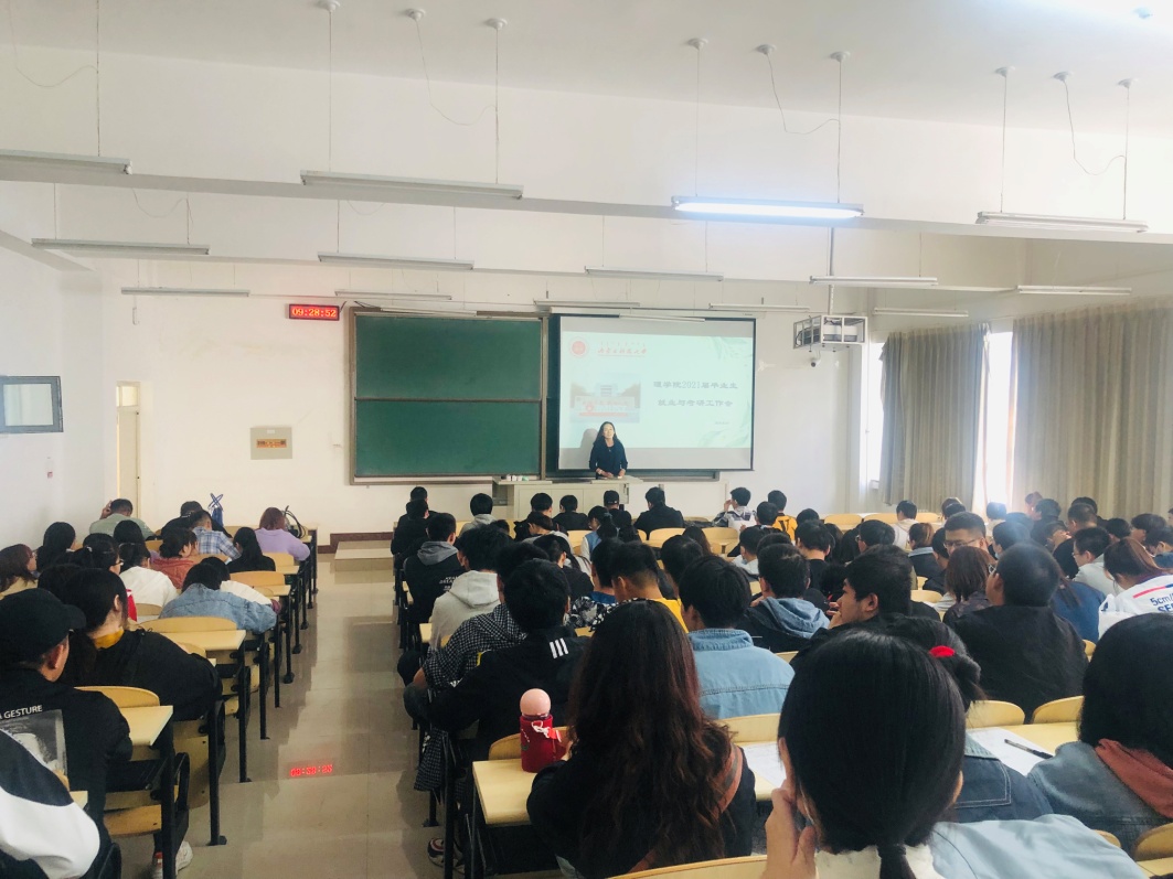 会议伊始,杨晓玲老师介绍了公司2020届毕业生总体就业情况,分析了疫情下就业新形势,建议毕业生要树立先就业再择业正确就业观,抓住“秋招”高峰期的就业机会,鼓励毕业生合理规划时间,考研就业同步进行。并帮助同学们分析了2021届就业形势,她分别从高校毕业生就业人数增加、宏观经济形势影响、疫情影响、物理及数学相关行业对毕业生需求变化、招聘政策方面详细地分析了相对严峻的就业形势。