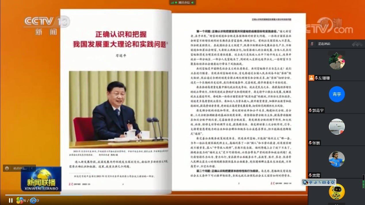 会上,通过视频的形式学习了习近平总书记在庆祝中国国际贸易促进委员会建会70周年大会暨全球贸易投资促进峰会上发表的视频、习近平总书记在《求是》杂志发表的重要文章《正确认识和把握我国发展重大理论和实践问题》、习近平总书记在博鳌亚洲论坛2022年年会开幕式上的主旨演讲等多项内容,通过学习我们深刻认识到习近平总书记对我国扩大高水平开放的决心,系列讲话精神充分体现了中国维护多边主义、积极开展国际合作的信念。