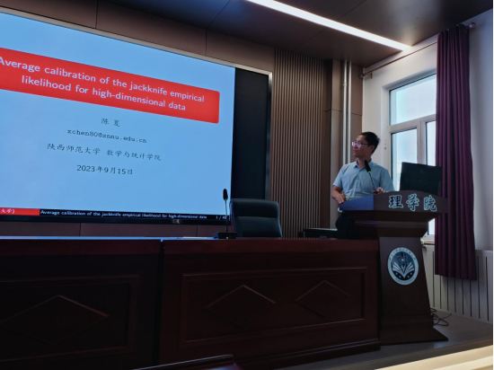 2023年9月15日上午9点,304永利集团邀请陕西师范大学数学与统计公司副经理陈夏教授在明德楼E205进行主题为“高维数据的刀切经验似然平均校准方法”的专题讲座,讲座由304永利集团科研副经理牛金艳副教授主持,公司数学老师、部分研究生、数学学科的四年级员工参加了本次讲座。