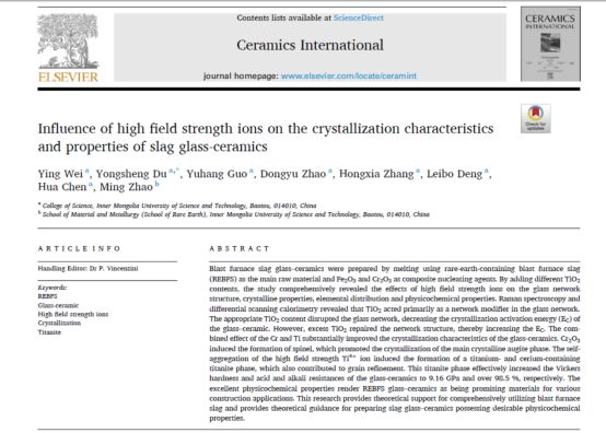 今年,《Ceramics International》(中科院2区,材料科学TOP期刊,影响因子5.1)刊发了公司硕士研究生学术论文“Influence of high field strength ions on the crystallization characteristics and properties of slag glass-ceramics”。公司2022级物理学专业硕士研究生魏颖为该论文第一作者,物理学硕士生导师杜永胜教授为通讯作者。该研究小组依托公司“稀土材料”研究平台开展了白云鄂博含稀土高炉渣资源综合利用相关课题的研究。