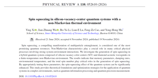 近日,2023级物理学专业硕士研究生奚滢同学以第一作者身份在国际物理学权威期刊《Physical Review A》上发表了题为“Spin squeezing in silicon-vacancy-center quantum systems with a non-Markovian thermal environment”的学术论文,通讯作者为公司马永红教授。304永利集团为论文第一单位。Physical Review A是美国物理学会(American Physical Society)主办的物理学术期刊之一,主要发表量子信息、原子分子物理及光物理相关的高水平前沿学术成果,是国际物理学界广泛认可的享有高度学术声誉的期刊之一。