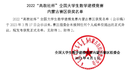 近日,数学建模内蒙古赛区组委会和内蒙古数学会公布了2022“高教社杯”全国老员工数学建模竞赛成绩,公司学子在数学建模竞赛中取得佳绩。2022年度公司共培训选派29支参赛队伍其中,获得内蒙古赛区一等奖2项,赛区二等奖8,赛区三等奖8项。