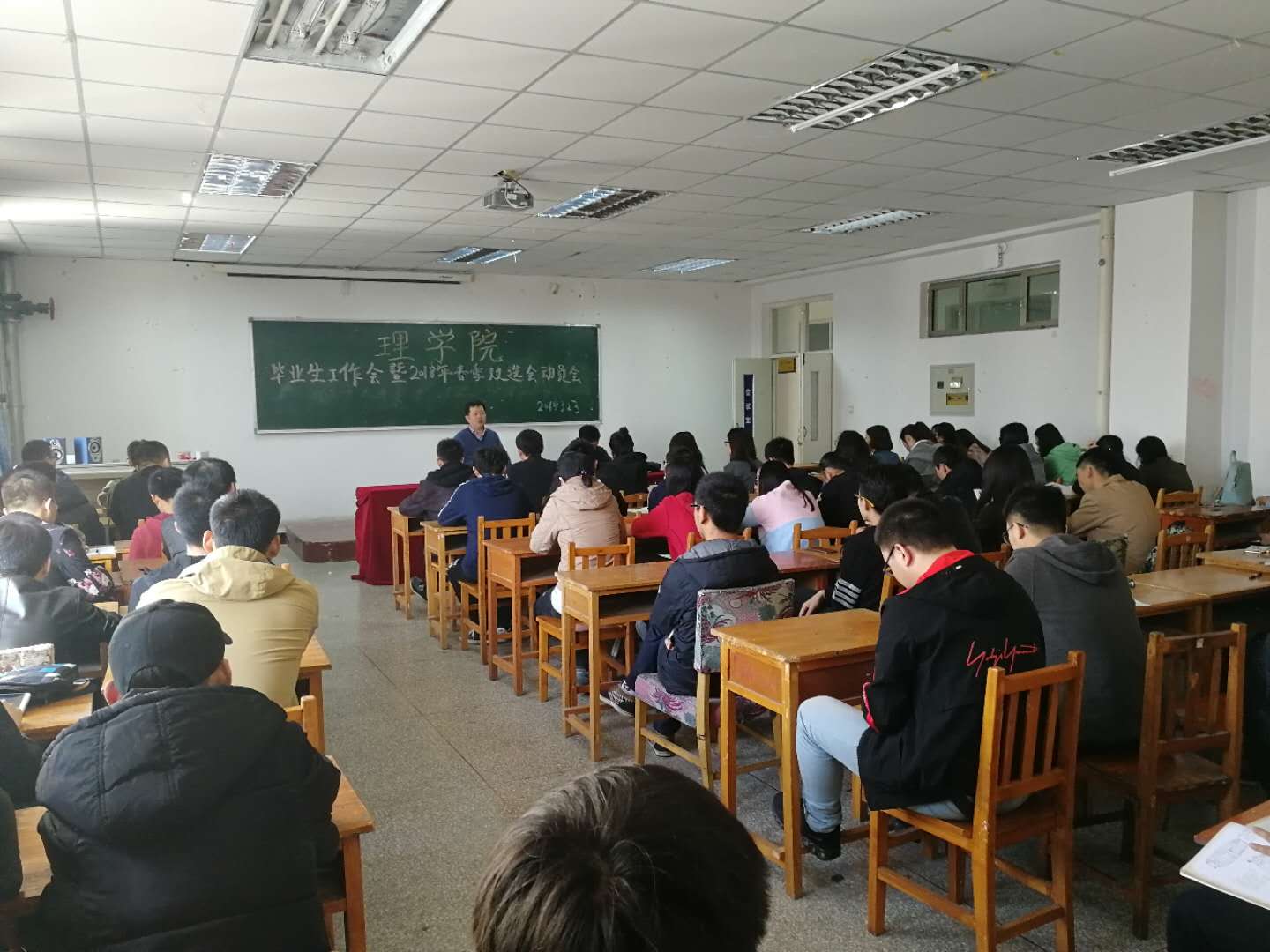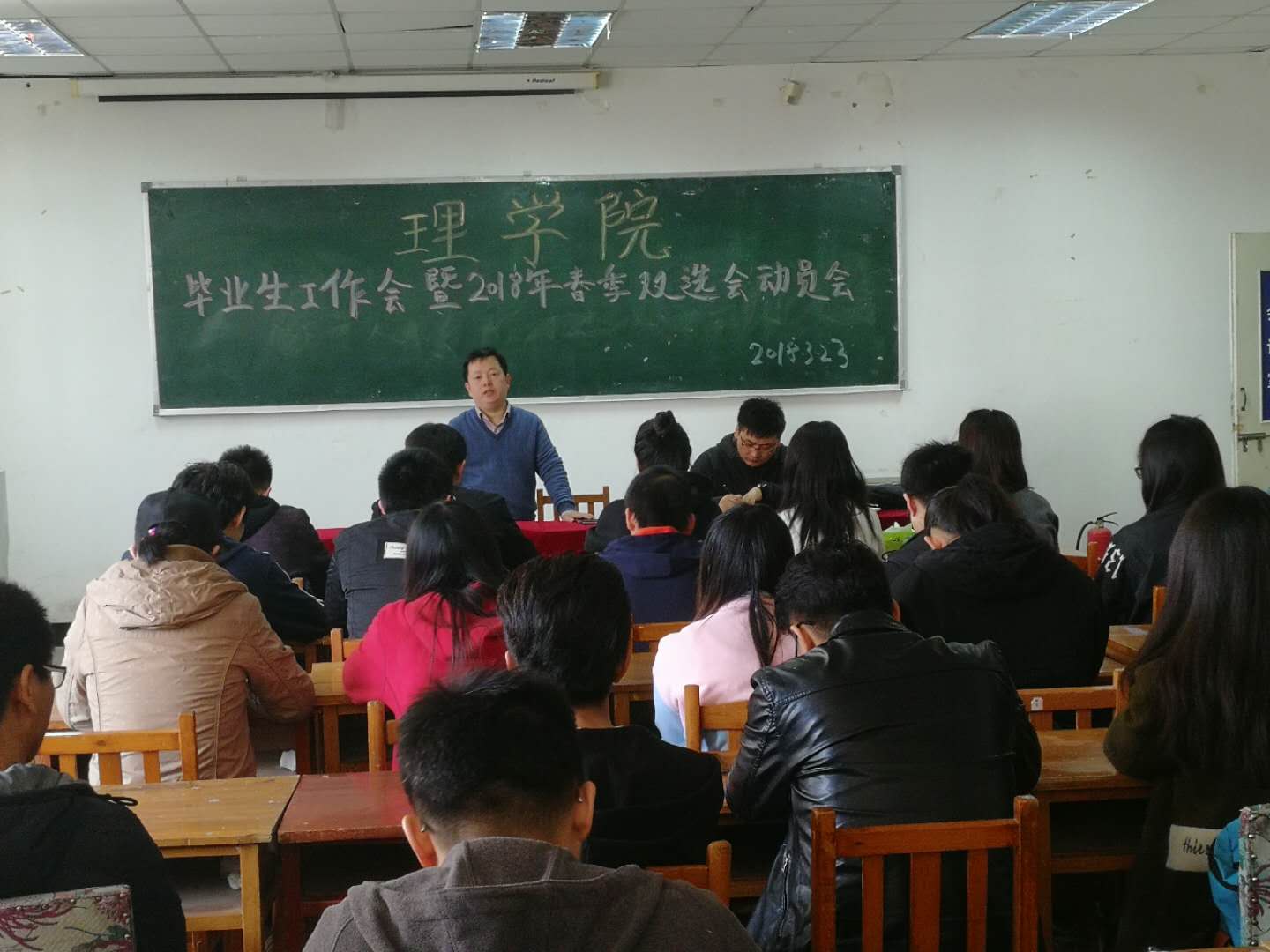 3月23日上午9:00,在秋实楼A507召开毕业生工作会暨2018年春季双选会动员会,会议由公司副书记,副经理罗宁主持,参会的还有公司就业工作负责老师包文明以及2014级数学班,2014级物理班全体同学。